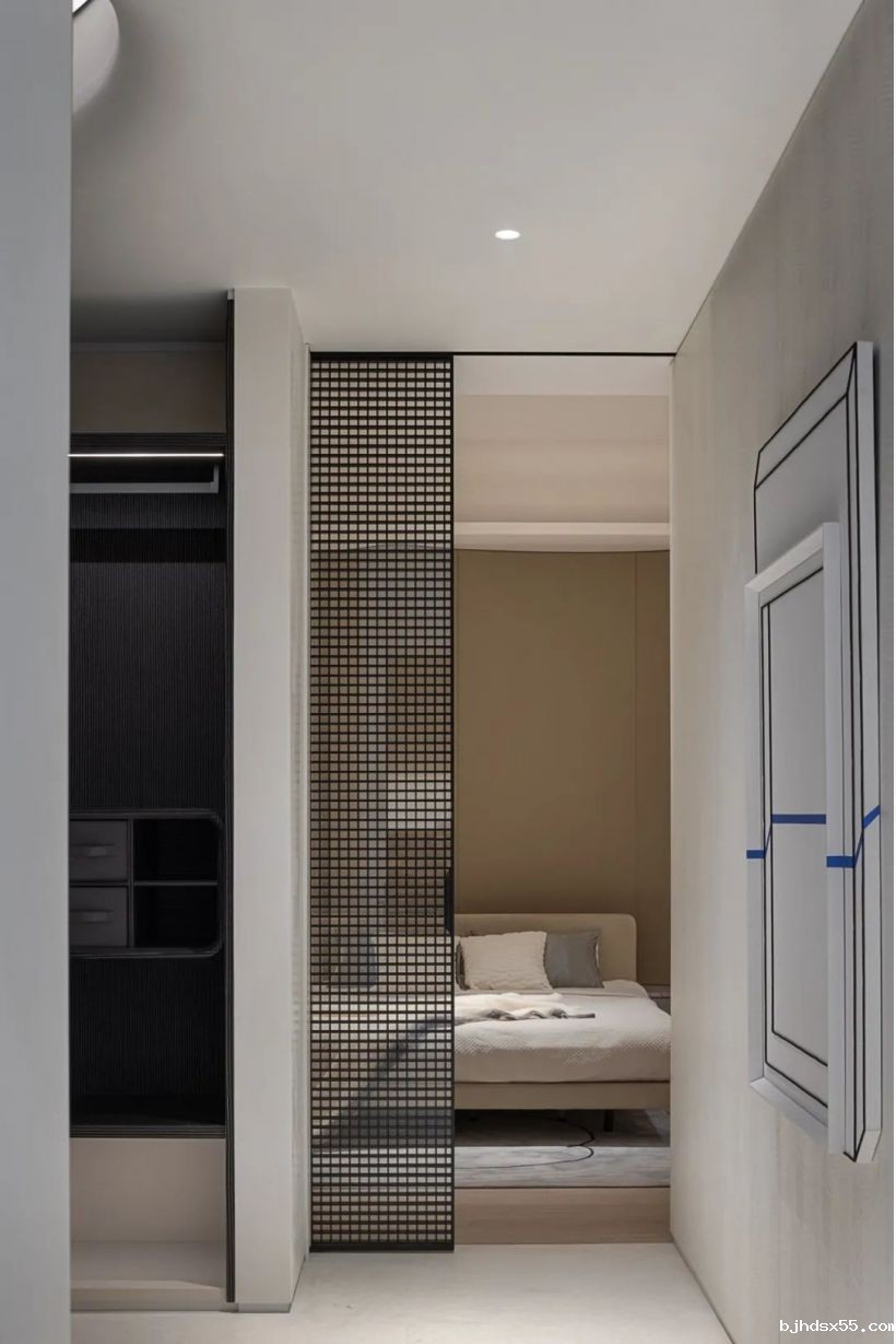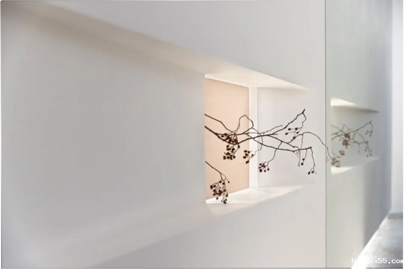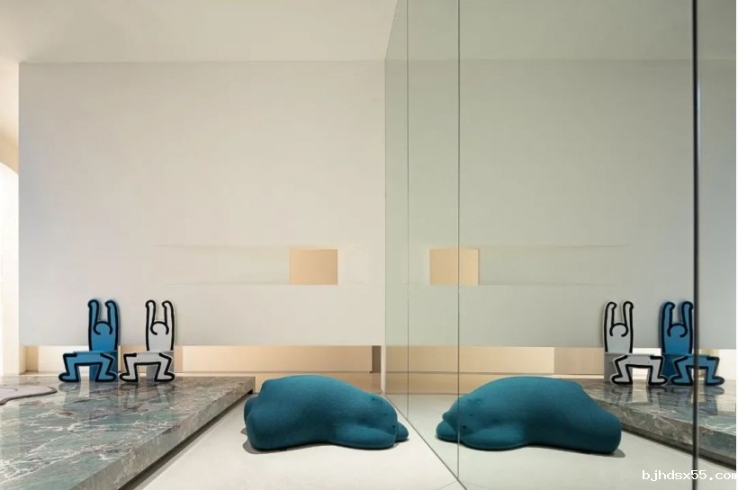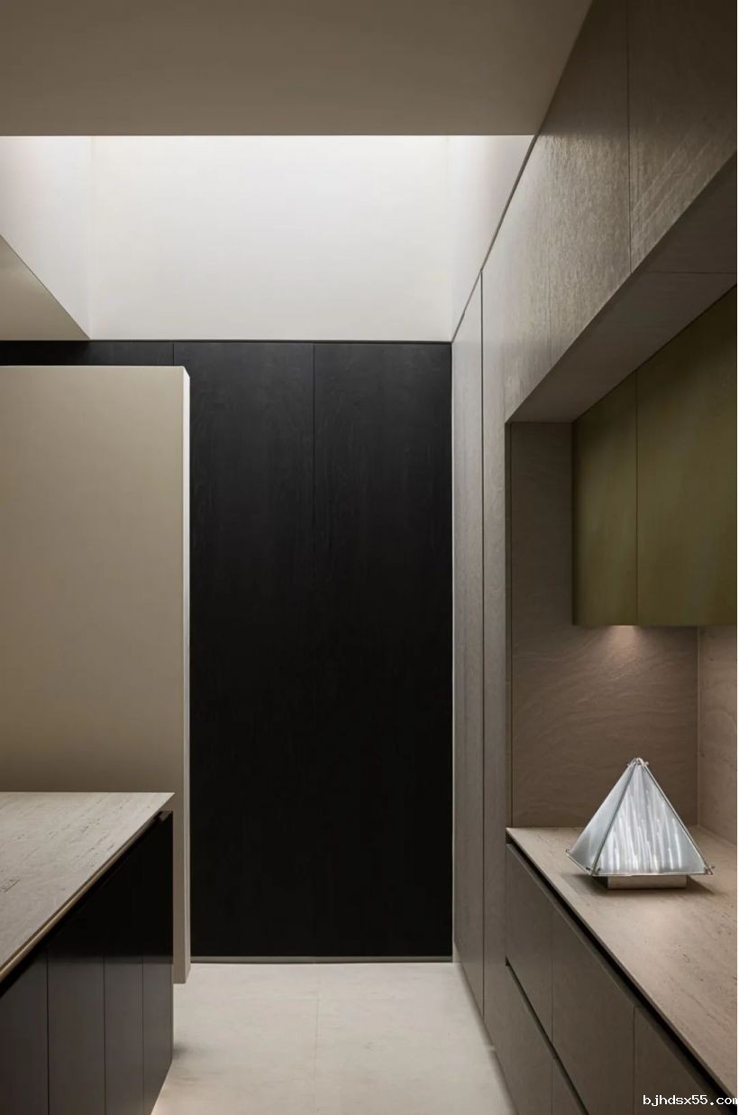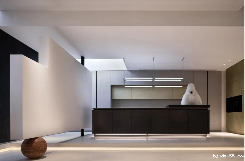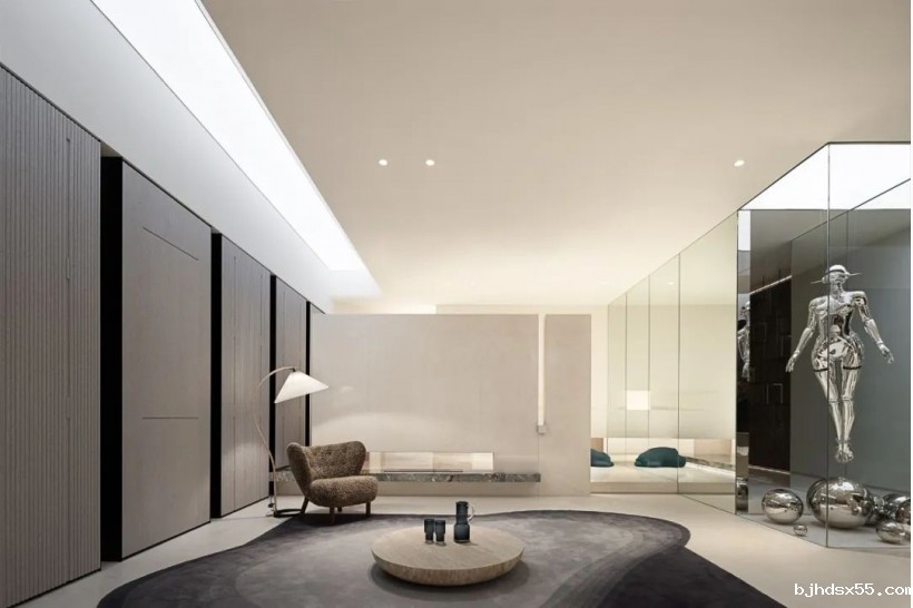 相较于封闭式的回廊,设计师用灯带承载了模糊空间分界的使命,设计师在纵深关系上反复使用这一手法,拉开多层次景深,进一步放大场域空间感。