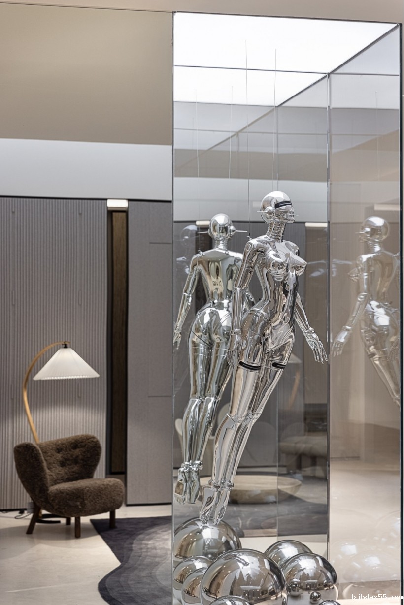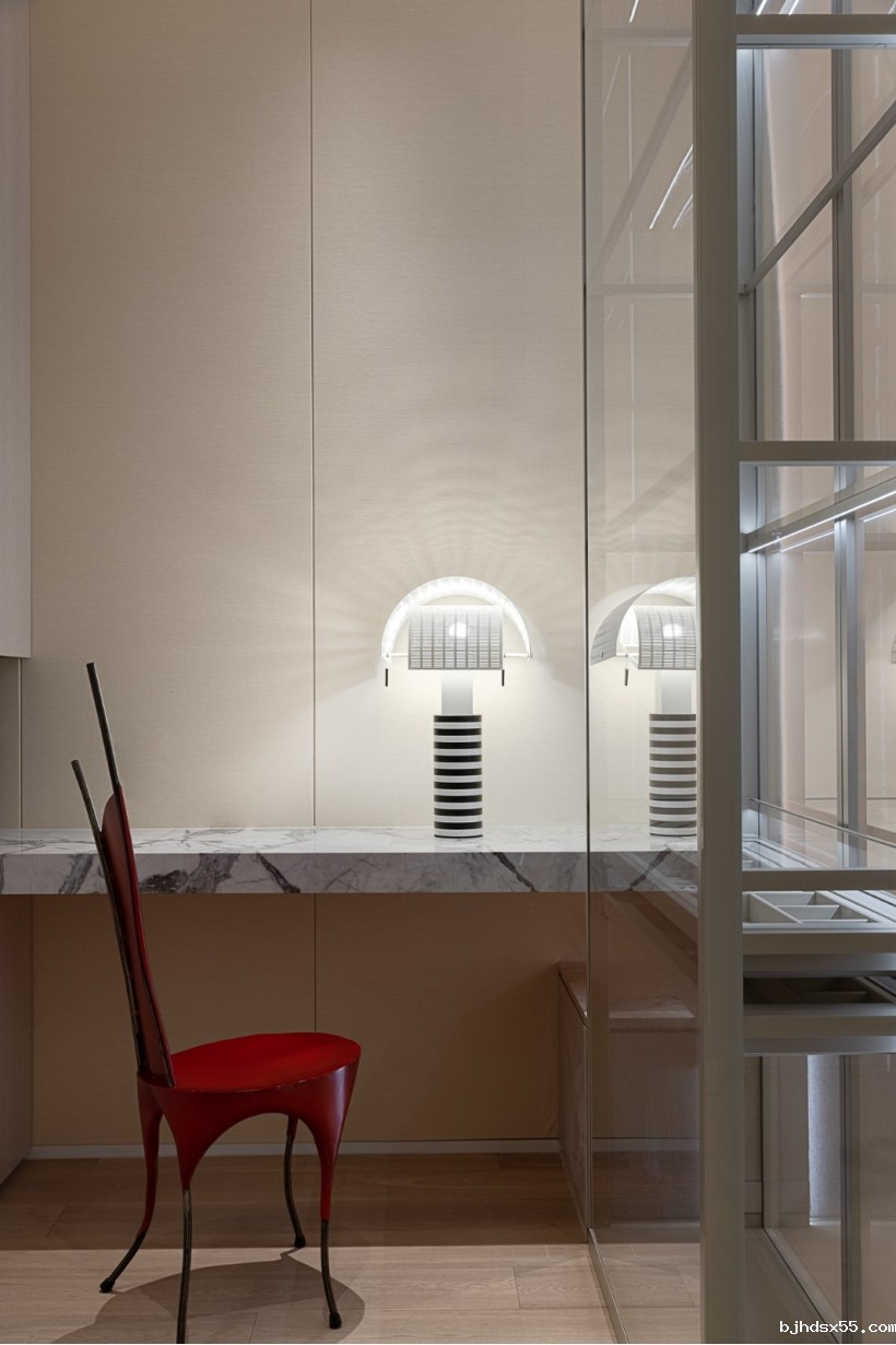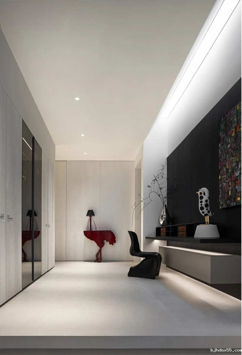 相较于封闭式的回廊,设计师用灯带承载了模糊空间分界的使命,设计师在纵深关系上反复使用这一手法,拉开多层次景深,进一步放大场域空间感。