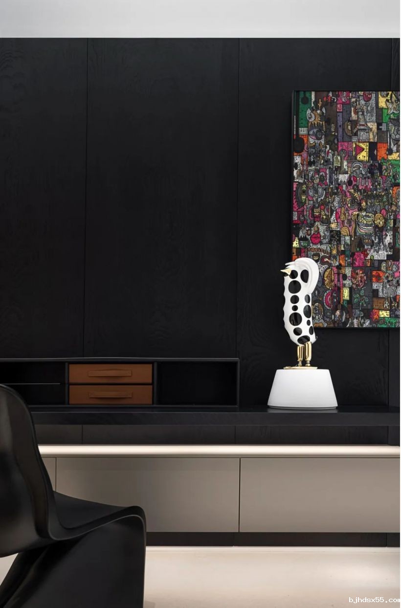 大面积的平板墙面,借助线性勾勒,都有着最适切的平衡。强烈对比的黑色元素背景成为开放式空间的中心,以艺术漆特有的哑光质感描绘出轮廓层次。