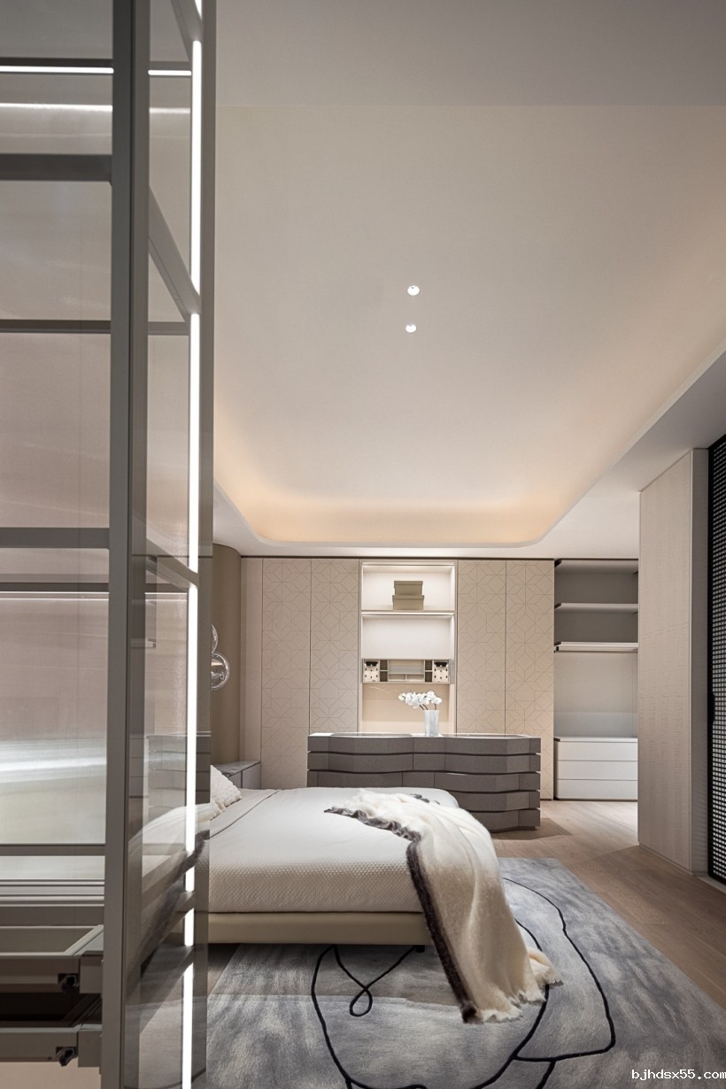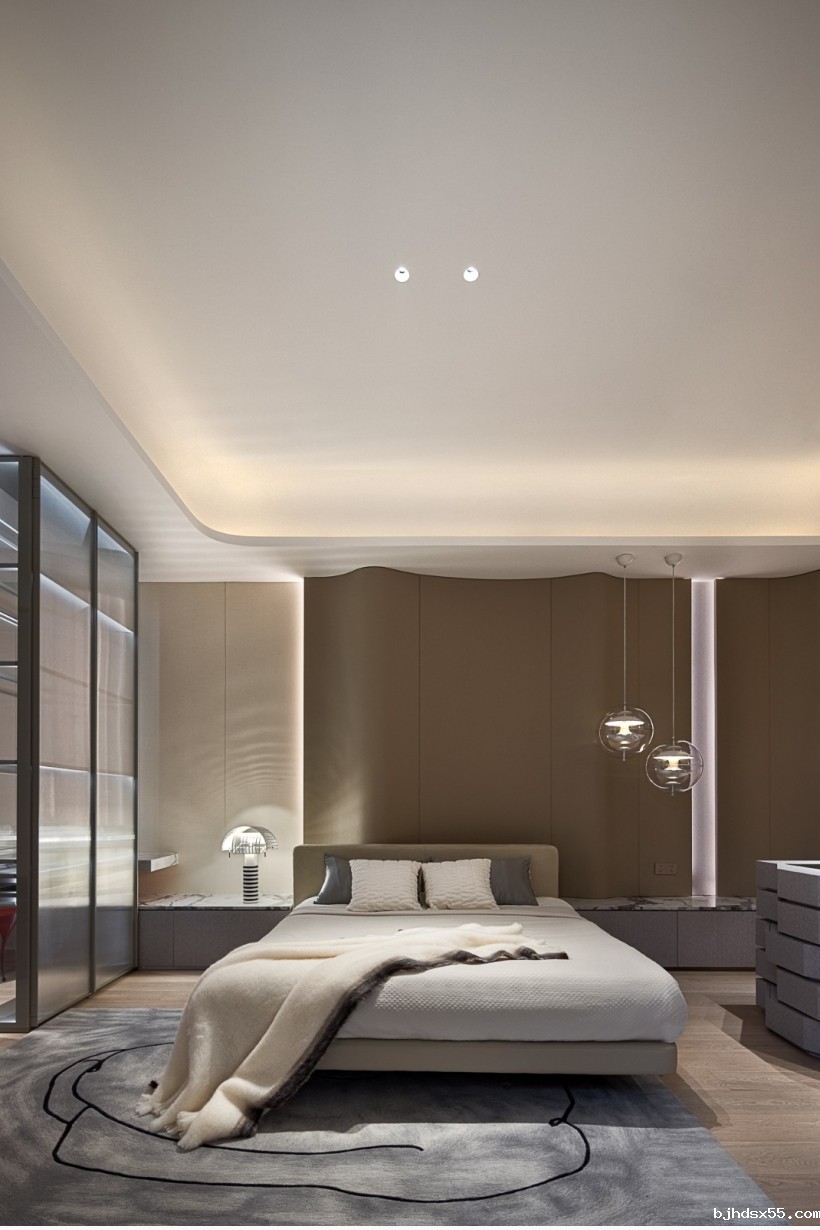 主卧延续着格栅柜面、皮毛、木饰面等等素雅材质的运用,通过木头的质朴感,极富肌理感的石皮,还原自然的本真。以新引入的曲线为特色,这些曲线与其他几何形式相得益彰,带来更富线性姿态的趣味性。